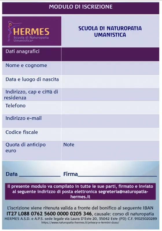 Per iscriversi è sufficiente compilare il modulo di iscrizione in tutte le sue parti ed effettuare il pagamento attraverso bonifico bancario alle seguenti coordinate IBAN: IT27 L088 0762 5600 0000 0205 346, specificando la causale del versamento: corsi di Naturopatia.