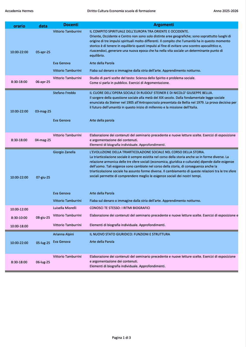 Dodici incontri di due giornate (uno al mese) secondo una struttura seminariale per prepararsi ai pensieri della Triarticolazione Sociale; sviluppando la capacità di parlarne in pubblico, perché è l'azione individuale che può cambiare la vita sociale.